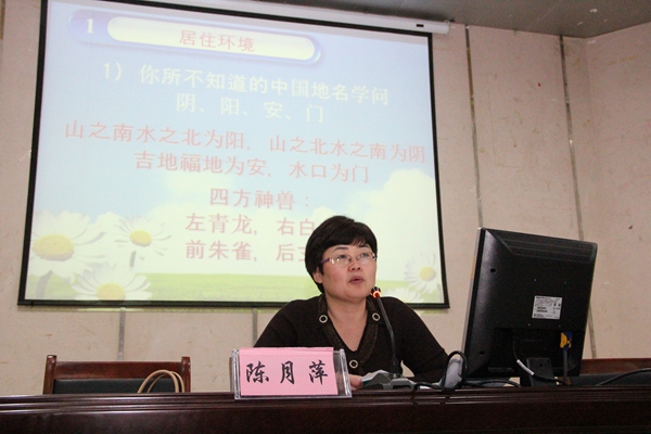 陈老师介绍了中国传统建筑在居住环境上的讲究,她结合大量的古建筑实例展示了中国古城、古村建筑文化,揭示了中国传统建筑理念与隐形建筑法则。接着,针对纷繁多样的现代化建筑,她通过展示大量图片进行专业分析,说明建筑装饰中如何巧妙智慧地设计,实现布局的科学性与艺术性。 讲座图文并茂,视角新颖,通俗易懂,妙趣横生,清晰明了地揭示中国人深奥的建筑智慧,拓展了同学们的专业视野,受到同学们的热烈欢迎。(文/黄 勤 图/武安宁)