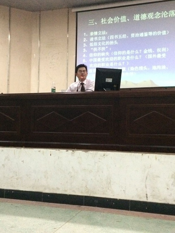 讲座结合现代人生活现状的具体事例,讲述当下中国十大社会经济热点,包括贫富差距、贪污腐败及社会价值观等,而人们尤为关注的养老、医疗及住房的社会保障问题也亟待解决。朱老师的讲解深入浅出、激情澎拜、发人深省,以全新的视角讲解了社会存在的问题及危害性,现场不时报以热烈的掌声。