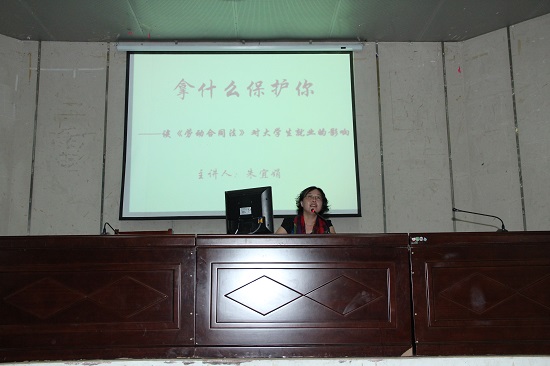 朱老师向同学们解读了“试用期工资”、“工资拖欠”、“跳槽赔偿金”、“自主创业”、“择业自主权”等与大学生就业中密切相关的热点话题,深入浅出地分析了《劳动合同法》中与大学生就业最相关的十五个条款及这些条款对今后大学生就业的影响,对大学生找工作过程中或刚开始工作时可能遇到的侵权行为,从新《劳动合同法》的角度为同学们介绍了维权的依据。 整场讲座历时两个小时,朱老师用幽默风趣的语言和严密的逻辑思维帮助大家解读了《劳动合同法》中关系到大学生就业的法律条款,让在座的每位同学都受益匪浅。 (文/秦潭学子 程康 王凡 图/强健康)