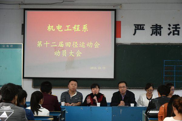 会上,系分管教学工作负责同志指出,此次运动会要在认真总结经验的基础上,锐意进取,开拓创新,争创佳绩;表示赛前要做到“积极备战、积极训练、科学训练”,赛场上要“服从裁判、服从教练、服从比赛规则”;加强宣传报道,让更多的人快速了解我系运动员的精神风貌;团总支学生会各部门要统一协作,做好后勤保障工作,服务好运动员,工作中遇到的问题要及时沟通,以确保运动会正常有序进行;同时强调,运动会是正常教学的重要组成部分,期间不得有非运动员请假的情况,要做到人人参与,塑造机电系的魂,展现出机电系的气势,对于该系历届运动会上较薄弱的项目,也提出了针对性的意见和建议。 此次动员大会的召开,拉开了该系备战校运动会的序幕,使广大运动员明确了目标,以饱满的热情和高扬的斗志整装待发,机电系在各项体育赛事上再创新辉煌奠定了基础。希望运动员们要鼓足干劲,振奋精神,刻苦训练,为机电系再创辉煌而拼搏。(文/杨梦丽、丁海娣 图/张朝)