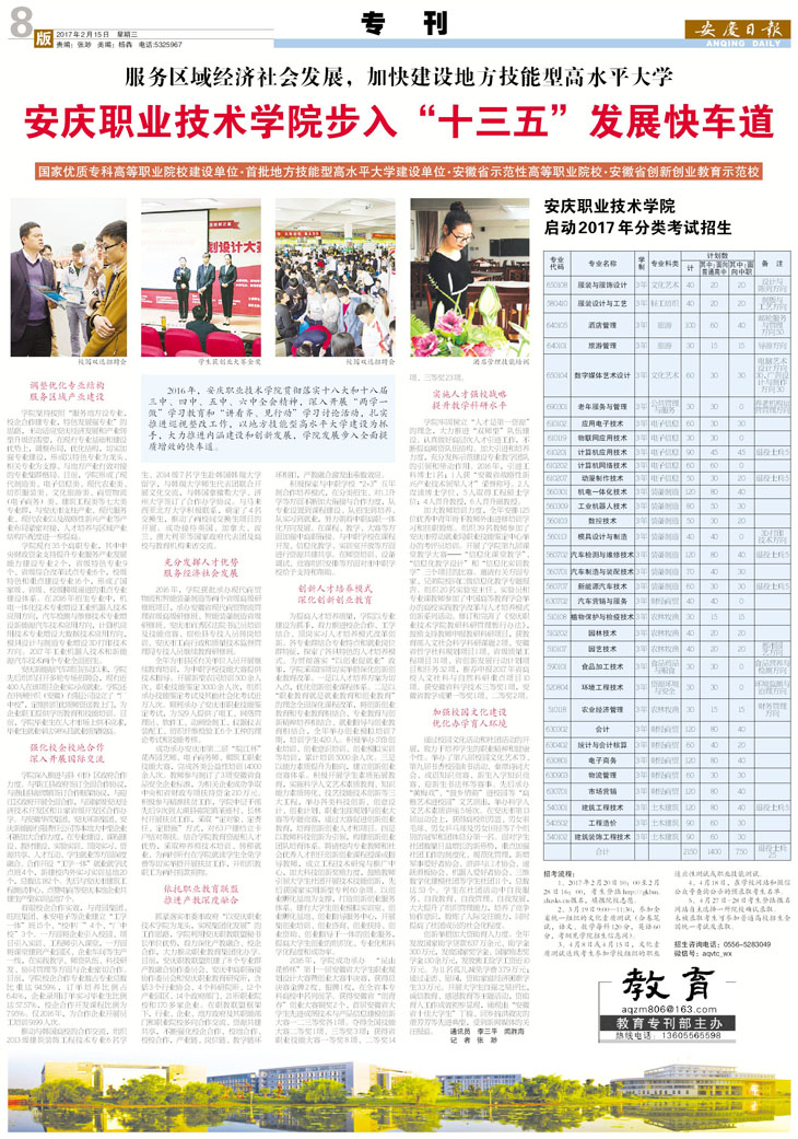 2017年2月15日,《安庆日报》以“服务区域经济社会发展 加快建设地方技能型高水平大学――bv伟德国际1946步入‘十三五’发展快车道”为题,整版报道我院“十三五”开局之年内涵建设和创新发展取得的新成绩。