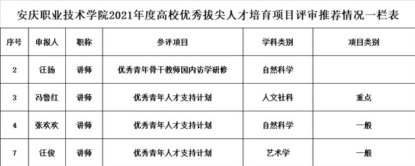 经各教学院部收集汇总、组织申报,学院组织专家评审,现将我院2021年度高校优秀拔尖人才培育项目评审推荐的有关情况进行公示(见附表)。