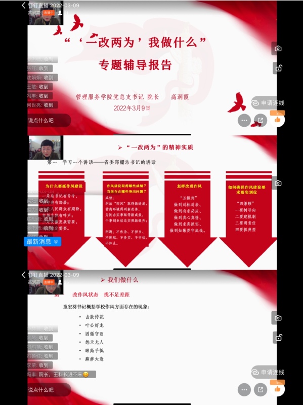 疫情防控不松懈,理论学习不放松。3月9日下午,管理服务学院党总支利用钉钉平台、通过线上直播课堂方式,组织开展“‘一改两为’我做什么”专题学习辅导活动,专题辅导由该院党总支书记、院长高润霞主讲,该院全体教职员工参加了活动。