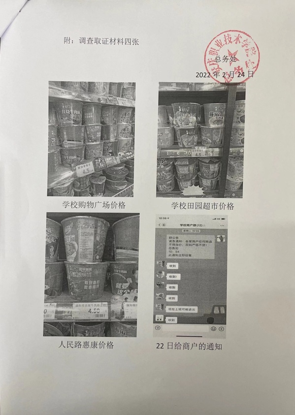 总务处一直关注十家商户和邮政物流的商品质量、服务态度,发现问题立即整改,如开学后疫情管控期间,接建工学院反映的康师傅“桶装香辣牛肉面”涨价问题后,立即安排专人对校内外超市进行调查取证,发现是厂家于春节后统一涨价5角,及时予以书面反馈,彻底打消同学们的顾虑;对今年“315晚会”曝光的老坛酸菜问题,第一时间建议超市下架相关涉事的方便面;近期又积极发动志愿者学生,利用购物时采取暗访方式进行检查,在接到两家商超疫情期间售卖加工水果的问题线索后,立即责令相关超市予以下架,并约谈了法人。