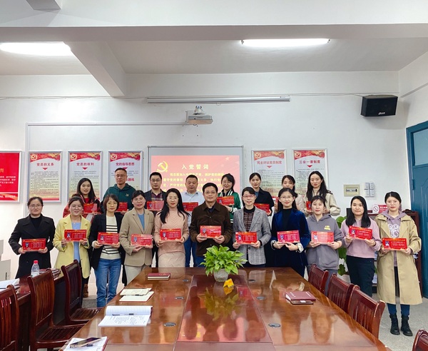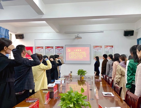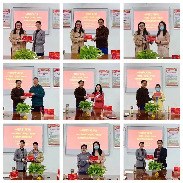 随后,陈颖给在场每位党员教师颁发了“党员先锋岗”座牌,勉励大家不忘从教初心,牢记育人使命,做到“立德树人铸师魂,不忘初心正师风”。党员教师们手捧先锋座牌逐一承诺:“对党忠诚、永葆初心;勤勉尽责,守正创新;服务师生,甘于奉献..........”最后,全体党员教师重温入党誓词,面对党旗庄严宣誓。