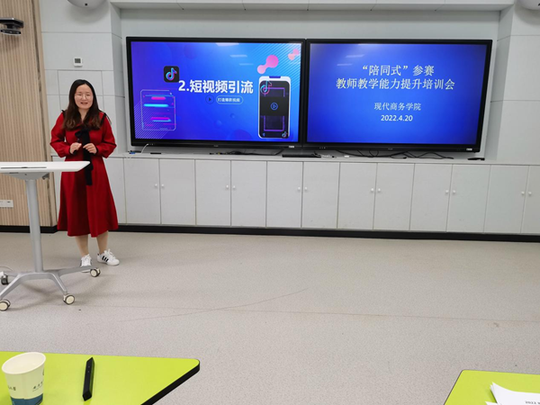 4月20日下午,现代商务学院在校2-102智慧教室举办教师教学能力提升展示交流活动,就“陪同式”备赛模式开展实践交流,全体教师参加此次活动。