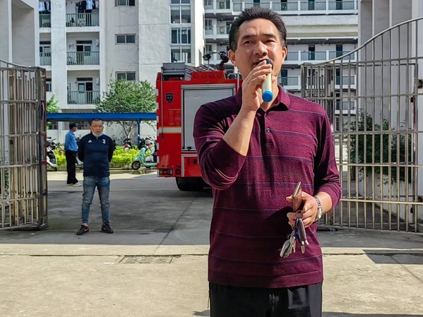 在男生宿舍2号楼,戎吴威站长向同学讲授了安全逃生的有关技能,随着消防车拉起了警报声,紧急逃生演练正式开始。各班级辅导员老师参照演习预定方案,火速到达指定位置组织200余名学生进行紧急疏散,全体师生用湿毛巾捂着口鼻,猫着腰,迅速而有序地撤离到广场,各班清点好人数立即向演练指挥部报告。整个过程仅用时2分25秒,演习取得了预期的效果。