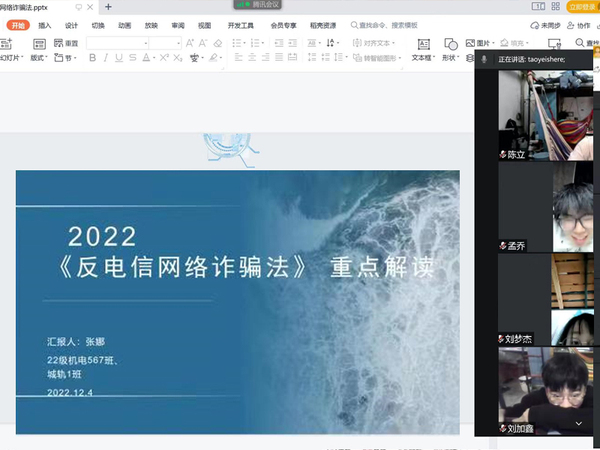 紧扣主题,掀起学习热潮。2022年12月4日是第九个国家宪法日,也是中国现行宪法公布施行四十周年。12月4日至10日是第五个宪法宣传周。宣传周活动的主题是‘学习宣传贯彻党的二十大精神,推动全面贯彻实施宪法’”。12月4日上午,全体辅导员老师通过线上会议方式,带领全体学生一起学习宪法内容。同学们端坐在电脑前,认真聆听辅导员介绍宪法知识,感悟宪法精神。