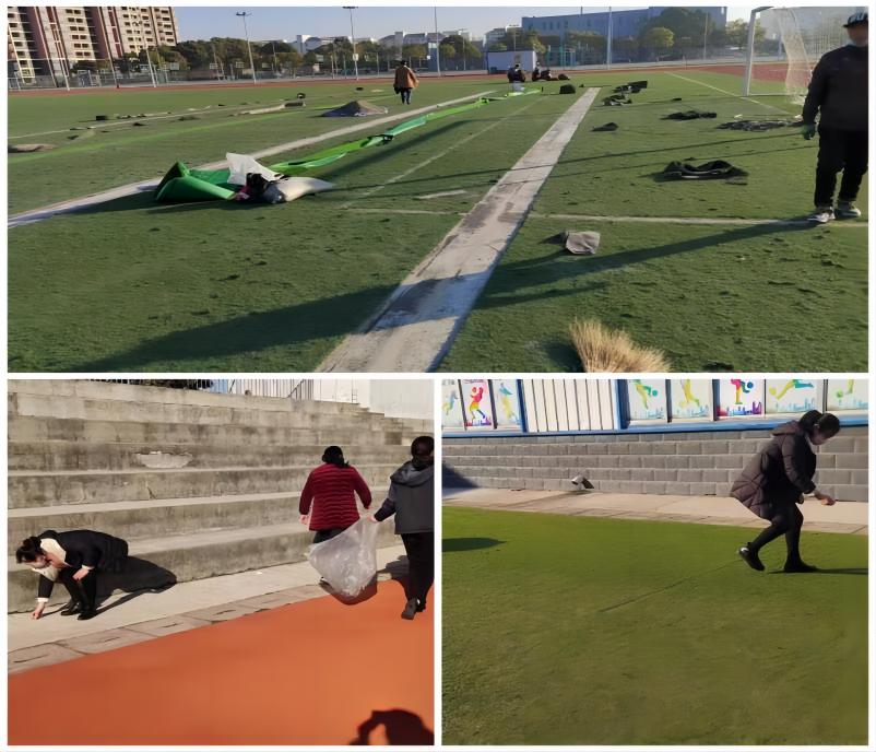 在运动场,公共基础部安排专业师傅正在维修足球场破损的人造草坪,参加义务劳动的党员教师和物业人员一起,清理运动场上的丢弃物。劳动创造美,绿茵场又美好如初,为2023年新春佳节增添喜庆。(文、图:左 潜 审稿:张 林)