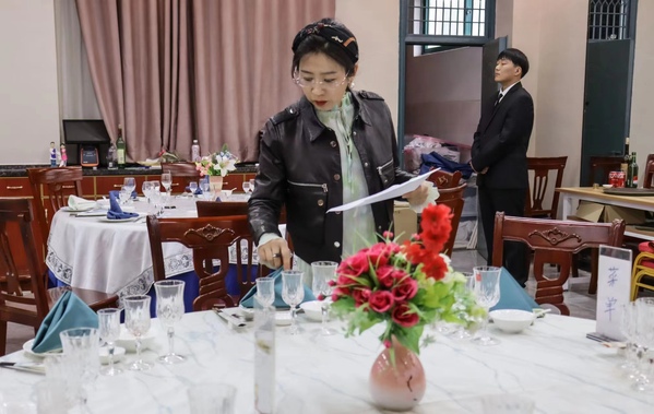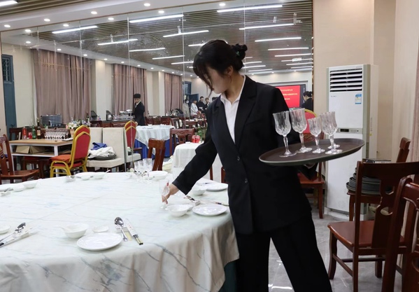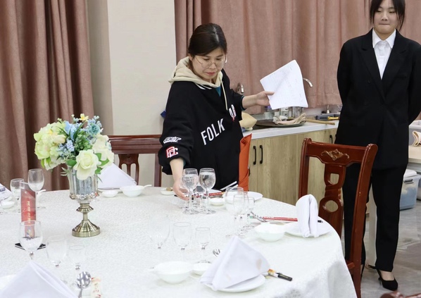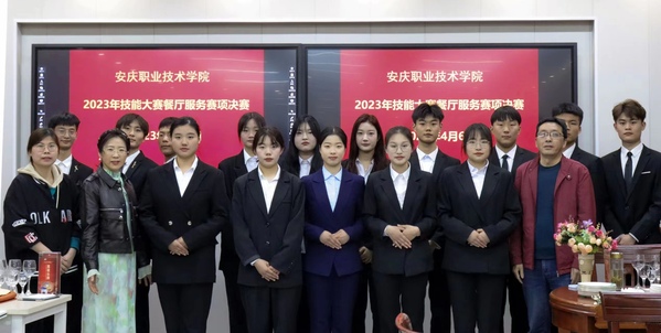 依据安徽省职业技能大赛“餐厅服务”赛项规程,比赛分为仪容仪表展示、中式宴会摆台以及斟酒服务三大环节。比赛现场秩序井然,酒店协会负责比赛筹备及现场服务、计时、统分等工作,选手们统一着装,技能娴熟、自信大方地体现了酒店人良好的职业素养。
