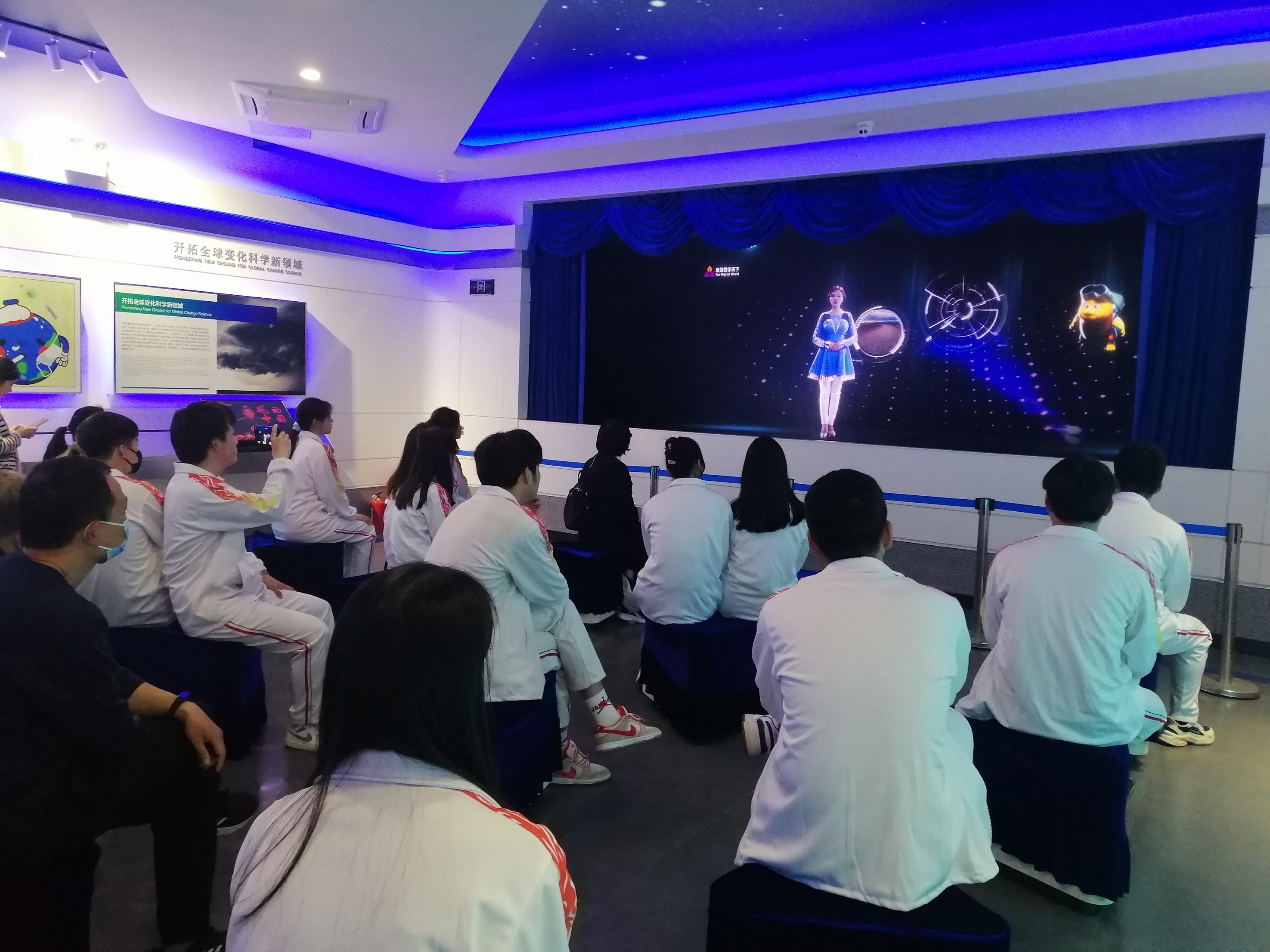 全体师生进入气象科普展厅,驻足观看文字、视频、实物等全方位的展示,以及全息影片的定时播放,对于叶笃正院士为国内、国际气象事业作出的杰出贡献有了更加全面的认知。局部天气现象的展示,讲解了全球气候变暖的成因和危害,同样让大家受益匪浅,学习到很多气象知识。