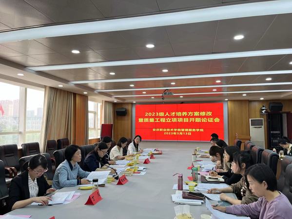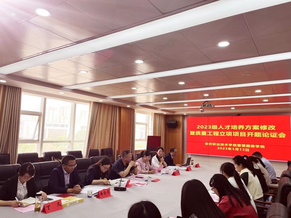 5月13日,管理服务学院在校行政楼第二会议室举办2023级人才培养方案修订论证会暨质量工程集体项目开题论证会。宁波卫生职业技术学院健康服务与康养学院院长朱晓卓教授、南京旅游职业学院酒店管理学院院长苏炜副教授,芜湖方特旅游区人力资源总监顾红艳、碧桂园酒店江苏区域人力资源总监何露露、安庆东升教育集团总经理潘金玉、安庆市石化医院儿科副主任医师王萍等应邀出席了论证会,学院全体教职工参加了本次论证会。