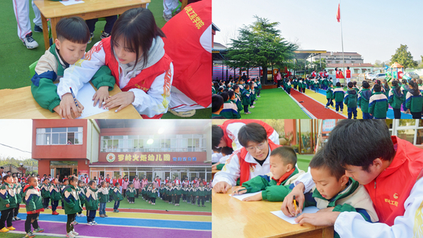 志愿者服务队,兵分两路。第一支志愿小分队来到罗岭火炬幼儿园,开展主题为“快乐童年,大手牵小手”的社会实践活动。活动的第一个环节是举行升旗仪式,由院学生组成的国旗护卫队迈着整齐划一、铿锵有力的步伐,护卫着鲜艳的五星红旗入场,伴随着雄壮的国歌,五星红旗冉冉升起,小朋友们个个昂首挺胸,向国旗行注目礼。升国旗仪式是爱国主义教育的重要途径之一,通过此仪式,增强了幼儿热爱国旗的意识,萌发了幼儿的爱国主义情感。随后,志愿者们在幼儿园老师的指导下,分组开展了实践活动。如“小小黏土创意无限”儿童手工活动、读书分享活动、防火防溺水安全教育、指导留守儿童给远方父母写一封亲情书信等活动,孩子们脸上洋溢着愉悦的笑容,这份快乐感染了现场的每一位参与者,整个活动过程中孩子们的欢声笑语久久回荡在校园。