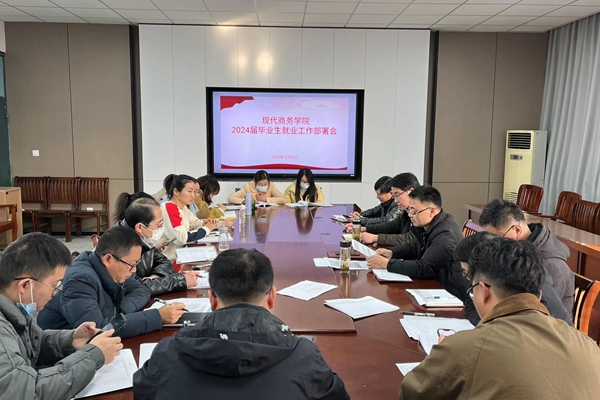 12月6日下午,现代商务学院召开2024届毕业生就业工作部署会。院党总支书记、院长金启胜出席会议并讲话。分管学生工作负责同志主持会议。学院2023届、2024届毕业班辅导员出席会议。