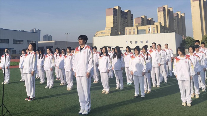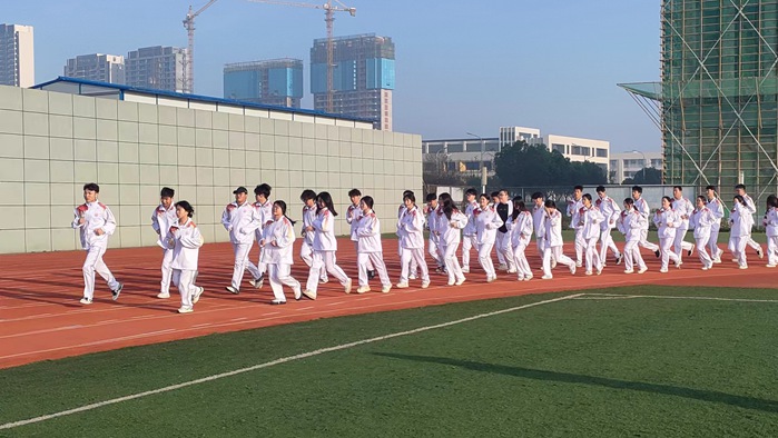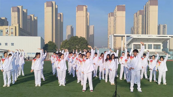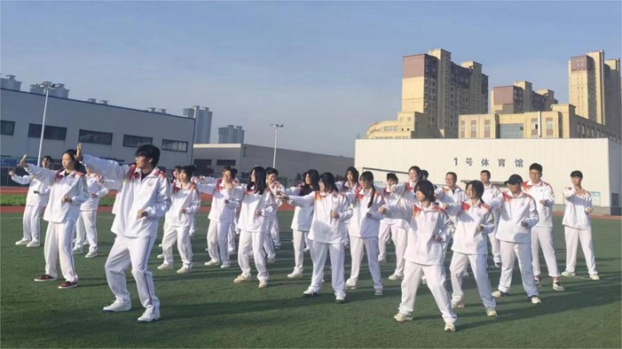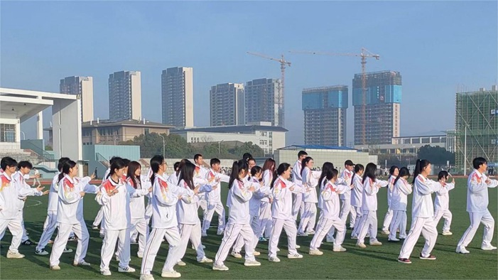 清晨的阳光洒在操场上,同学们身着校服,兴致勃勃地聚集在一起。在简单的热身后,开始认真学习八段锦的动作和技巧。