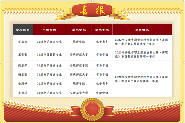 4月16日获悉,现代商务学院24届毕业生雷成宏、魏唐平、王贺贺、徐颖峰、饶玉莹、李雨乐已通过2024年普高“专升本”面试,提前被安庆师范大学、皖西学院、合肥师范学院、安徽工业大学等4所本科院校录取。这6名学生都是通过参加安徽省职业院校技能大赛获得一等奖,取得了2024年普高“专升本”招生免笔试资格,更经努力复习备考顺利通过了面试。