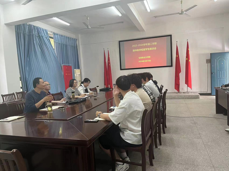 为进一步规范教学管理工作,加强教风学风建设,提高大思政课教学质量,5月10日下午,马克思主义学院在3号教学楼106会议室召开期中教学检查学生座谈会,会议邀请校教学督导胡建国教授出席,马克思主义学院院长余锋、教研室主任及各二级学院学生思政委员代表参会。教学副院长余世建主持会议。