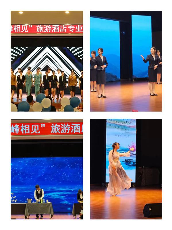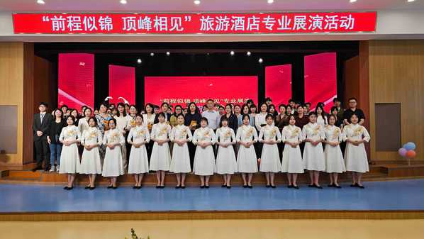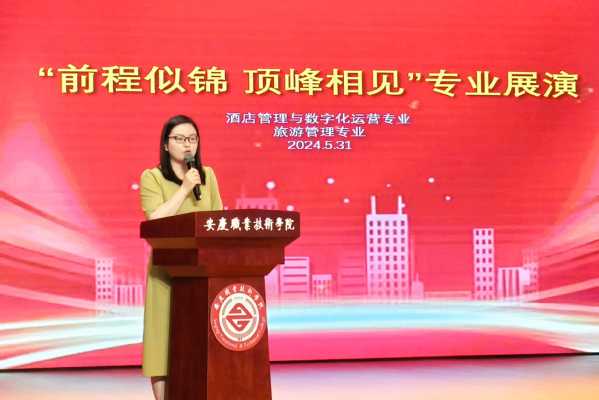 为提升和检验专业技能学习成效,促进课程思政第一课堂与第二课堂同向同行,推动毕业生本地就业,5月31日下午,管理服务学院酒店数字化运营、旅游管理专业联合在幼儿三期实训室举行“前程似锦·顶峰相见”校企共联专业展演活动。活动邀请了安庆会展中心会议中心酒店、合肥丰大国际酒店、安庆丰大酒店、安庆香澜豪庭酒店、安庆碧桂园凤凰酒店、安庆世纪缘酒店、中国移动安庆分公司等文旅相关企业出席。学校教务处、校团委等负责同志、管理服务学院班子及师生代表参加了此次展演活动。