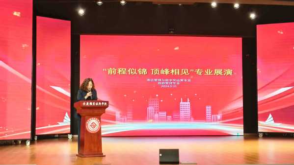 管理服务学院院长陈颖致辞,代表学院师生感谢莅临活动现场的企业来宾、学校相关部门等对管理服务学院专业建设、实习就业、学生成长成才等各项工作的热忱关心和大力支持;寄语即将走上实习就业工作岗位的2022级旅游酒店专业同学,要求大家树立正确的择业观和就业观,积极转变身份角色,尽早树立职场意识;坚定信念遵守职业道德,勇敢追求人生理想;深入了解安庆历史人文、熟悉安庆产业企业、关心安庆建设发展,以实际行动助力美好安庆建设;同时对2023级同学提出殷切希望,要求大一同学在校期间努力学好专业理论知识、积极提升专业操作技能、全面丰富人文道德素养,真正践行“勤学笃行 德技双馨”的校训精神。安庆会展中心会议中心酒店总经理丁敏代表企业发言,她指出未来的企业竞争是人才的竞争,学习能力和专业技能是高职同学们成功的核心竞争力,希望同学们不断更新知识、提高综合素养,志存高远脚踏实地,勇往直前未来可期 。