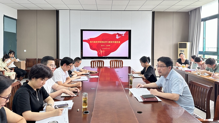 6月19日下午,现代商务学院党总支书记金启胜以《学党纪、知党纪、明党纪、守党纪》为题,为该院全体教师党员讲授党纪学习教育专题党课,全体教师党员参加学习。