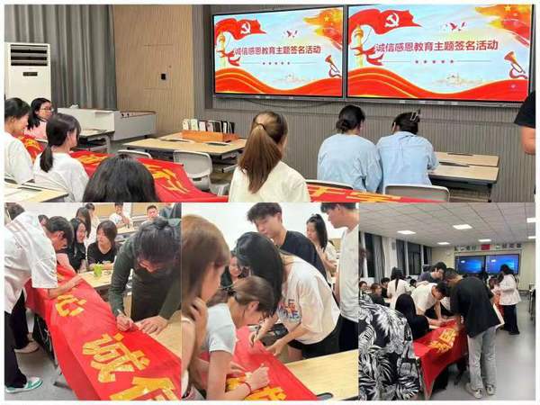 为营造浓厚的诚信氛围,该院组织开展了“感恩于心、诚信于行、励志于学”主题签名活动。活动前,志愿者们在现场通过知识宣传等形式,向同学们普及了诚信的内涵和意义。随后,同学们在横幅上郑重地签上了自己的名字,表达了对诚信的坚定信念和决心。签名活动不仅增强了学生的诚信意识,也进一步加深了同学们对诚信文化的理解和认同。